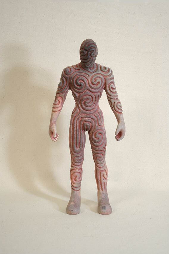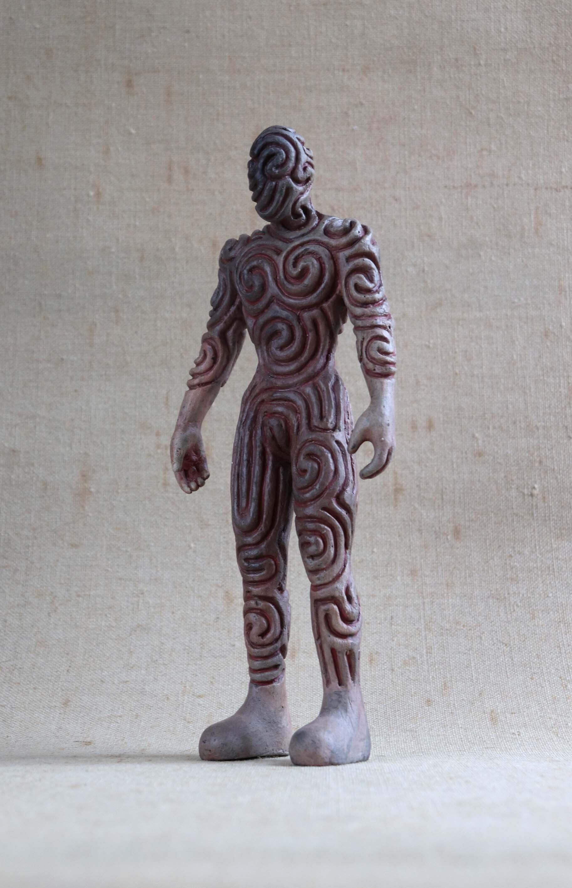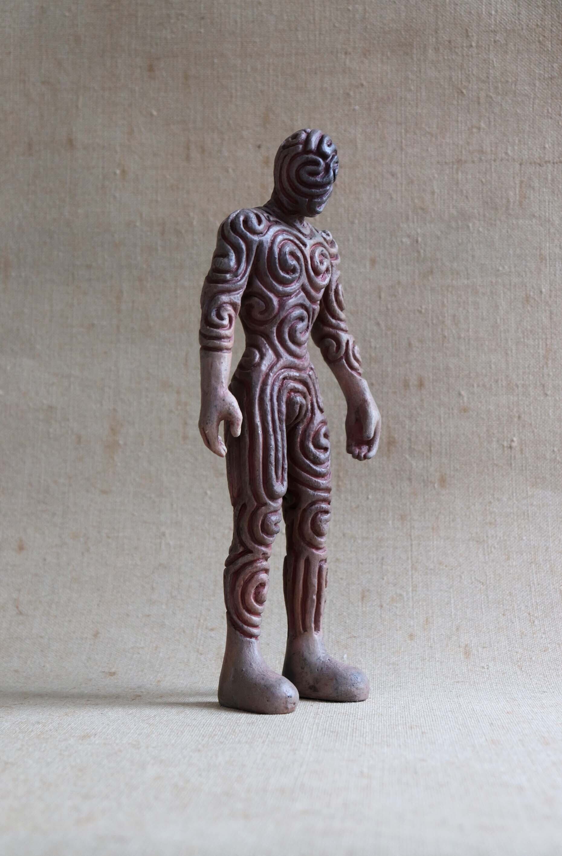 縄文時代の土器、土偶と同じように粘土でつくり、野焼きした焼きもの彫刻です。