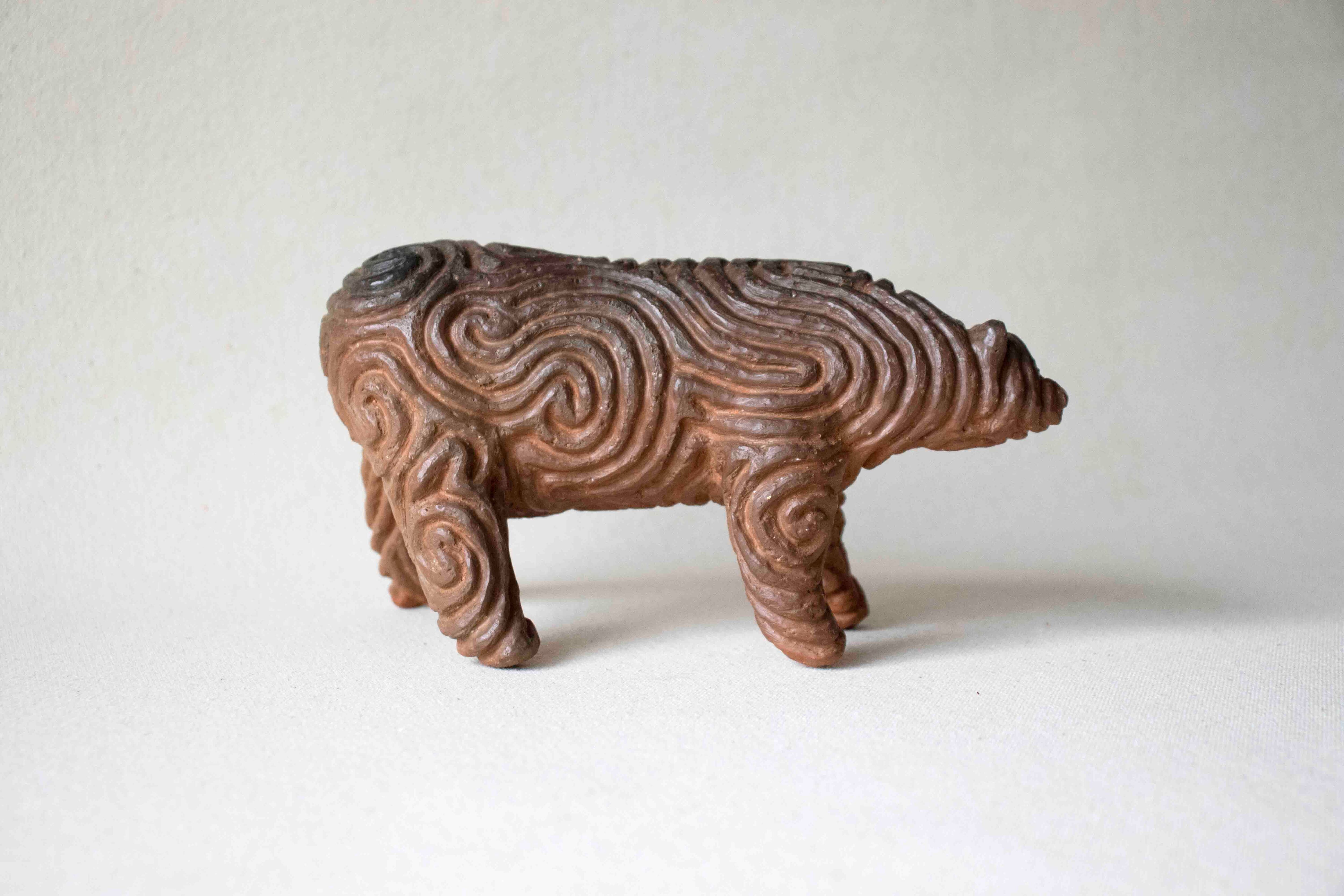 粘土でつくり、縄文時代の土器・土偶と同じように屋外の焚き火で野焼きした焼きもの彫刻です。